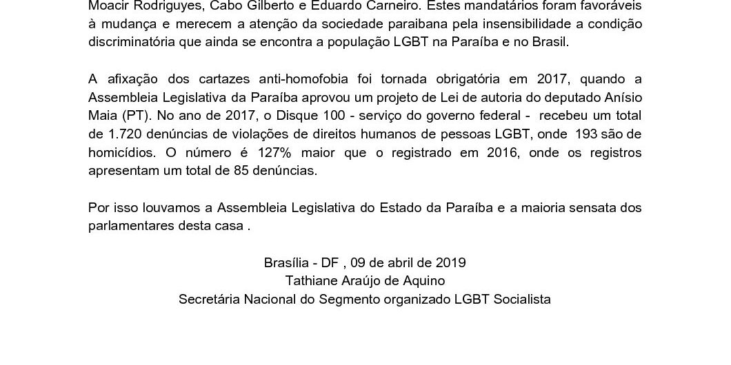 abr102019destaquesNota de louvor Category: destaquesPor Edem Santos10 de abril de 2019Marcações: Nota de louvor Assembleia Legislativa do estado da Paraíba Autor: Edem Santos Navegação de post:AnteriorPost anterior:Cartaz contra a homofobia continua obrigatório na ParaíbaPróximoPróximo post:EM JOÃO PESSOA CARTAZES FICAM! CIDADANIA LGBT GARANTIDARelated PostsNota de Convocação | V Congresso Nacional do LGBT Socialista30 de abril de 2025Comunicado aos segmentos nos estados que realizaram ou estão prestes a realizar os congressos estaduais do Segmento LGBTSOCIALISTA16 de abril de 2025Orientações para o Processo Congressual do Segmento LGBT Socialista12 de março de 2025Nota de Repúdio à Homofobia e Ataques à Criança em Porteiras (CE)4 de outubro de 2024Eleições 2024: o avanço e a luta das candidaturas LGBT+ no Brasil27 de setembro de 2024Andrey Lemos é nomeado Diretor do Departamento de Prevenção e Promoção da Saúde27 de janeiro de 2023